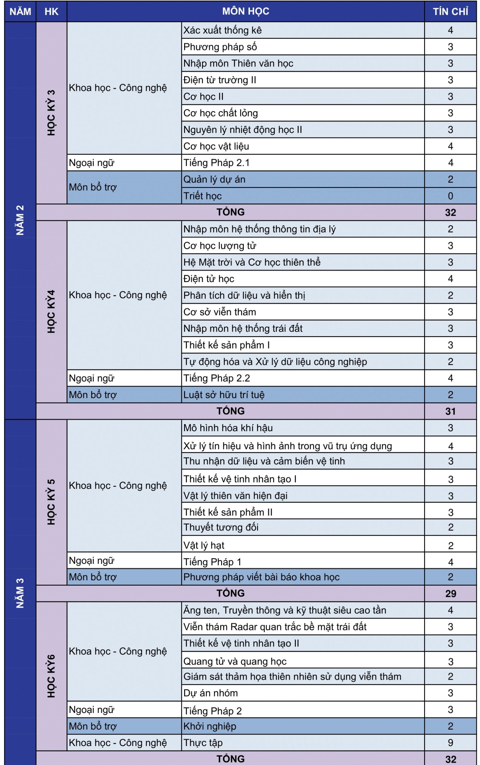 Từ năm thứ hai, sinh viên sẽ được cung cấp đầy đủ kiến thức/kỹ năng/công cụ/phương pháp luận về khoa học/công nghệ bao gồm nhiều lĩnh vực. Từ đó, các môn học chính tập trung trong lĩnh vực Khoa học Vũ trụ / công nghệ và ứng dụng, bao gồm Quan sát trái đất và Mô hình hóa, Vật lý thiên văn và công nghệ vệ tinh.